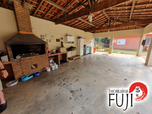 Amplo salão com churrasqueira e pia.